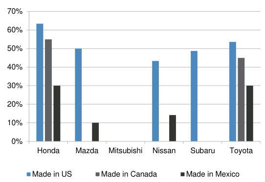 原因也很浅易,日本车受关税的影响相比小,早在 2020 年,本田在好意思国的国产化率就还是高达 80%(最近几年有下滑),丰田也接近 60%。