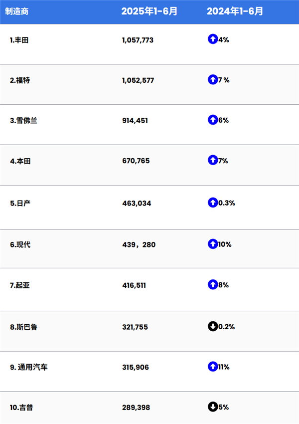 本年上半年的好意思国汽车销量,基本上清一色的日本车