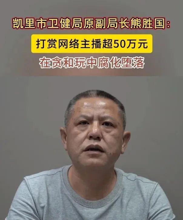 11月26日,贵州省纪委监委发布短视频《失守|凯里市卫健局原副局长熊胜国:在贪和玩中陶醉失足》,表现贵州凯里市卫健局原副局长熊胜国非法坐法细节,其中提到熊胜国将大部分接纳的公正用度于打赏汇聚主播,而其打赏汇聚女主播破耗超50万元。